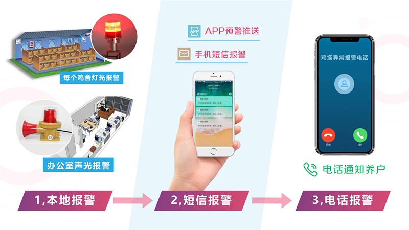 - 云平台收到所有鸡舍数据后,APP可以实时看到所有数据,可以在PC管理系统查找所有数据记录,导出分析。当收到报警信息时候,平台会分级自动处理,根据安全报警级别,分别选择拨打报警电话通知用户,发送报警短信告知用户,APP会主动推送预警信息。